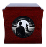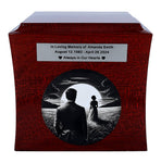 On the front of the urn, there is an engraved graphic depicting a poignant scene: a woman walking towards the sun, leaving a man standing alone. This touching imagery symbolizes the journey of life and the enduring love that remains even after a loved one has passed. The circle shape of the engraving represents eternity and the unending connection you share with your wife.