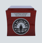 The urn is box-shaped with slightly rounded edges, made of mahogany wood. It has a removable bottom through which the ashes are placed. It is recommended to place the ashes in the urn in a plastic bag and to seal the bottom with glue or silicone.