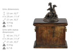 The solid wood memorial casket for pets with bronze statue features a top opening and two bronze handles on each side adorned with wreaths. The birch wood is expertly finished and polished, resulting in a beautiful and high-quality final product. While nothing can replace the loss of a beloved pet, this beautiful pet urn for ashes provides a way to celebrate their life and keep their memory alive. This pet urn for ashes is a timeless piece of art that will complement any home decor.