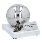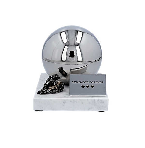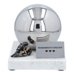 Stainless steel cremation urn in the shape of a ball. A durable combination of a marble base and a stainless steel sphere where the ashes are placed.