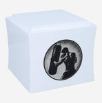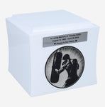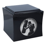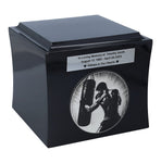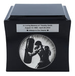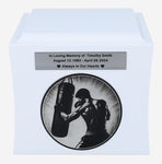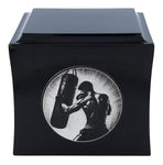If you want to honour the memory of someone who walked through life with strength, character and determination, a boxing urn would be a beautiful and symbolic choice. Created with athletes, fighters and anyone who was not afraid to fight - not only in the ring, but also in everyday life.The urn is shaped like an elegant box, with gently rounded edges. It is available in two classic colours - black or white- to match the taste and character of the deceased. The front features an engraved graphic of a boxer in training - an image of strength, focus and passion. Above the graphic is a personalised plaque where you can include a name, dates or a personal message.The ashes are placed through a removable bottom, bolted down with sturdy screws - so you are assured that everything remains secure and permanent.